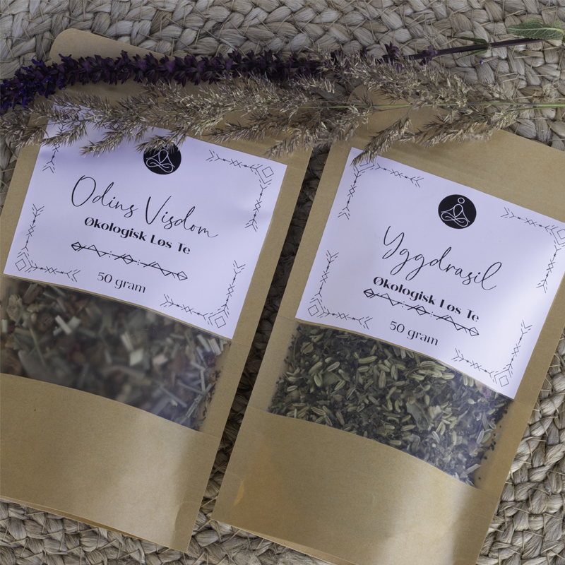 Vores emballage er enkel og bæredygtig, og mange af teerne er inspireret af gamle nordiske fortællinger og spirituelle symboler.