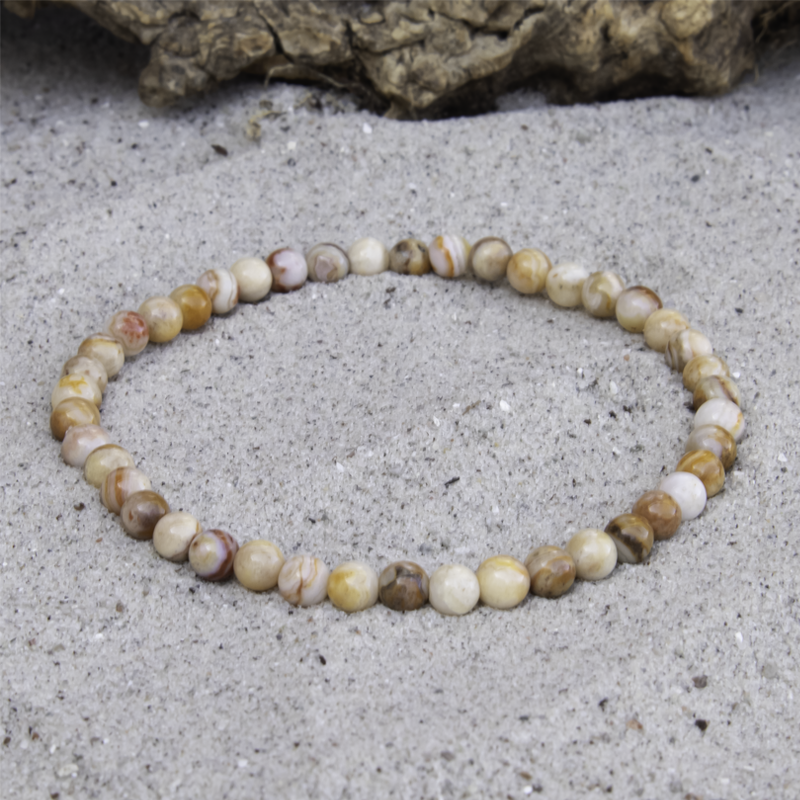 Smukt armbånd i Crazy Lace Agat med 4 mm polerede kugler, sat på elastisk tråd, så det er fleksibelt og behageligt at bære. Stenen er kendt for sine fascinerende mønstre i jordtoner blandet med livlige farver – hver perle er et unikt lille kunstværk.