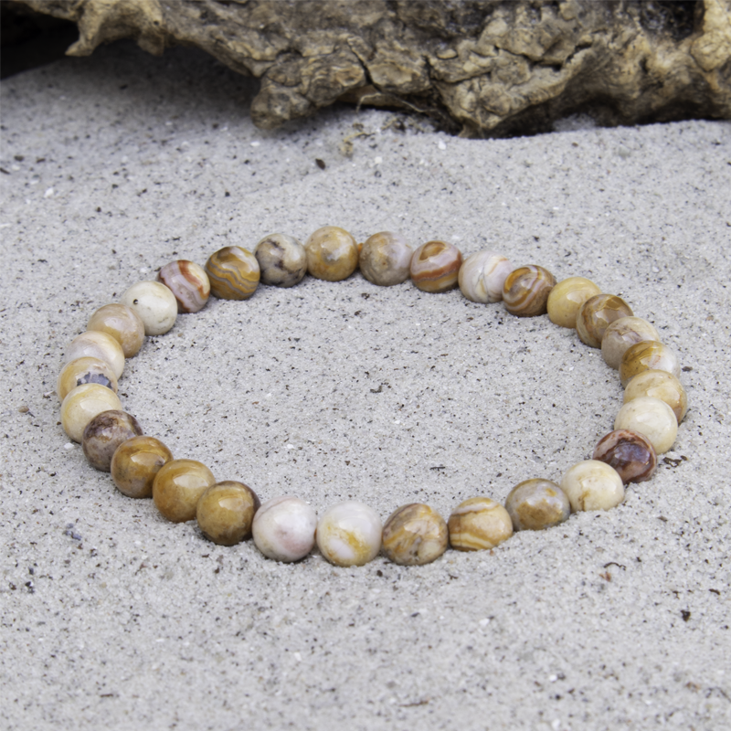 Smukt armbånd i Crazy Lace Agat med 6 mm polerede kugler, sat på elastisk tråd, så det er fleksibelt og behageligt at bære. Stenen er kendt for sine fascinerende mønstre i jordtoner blandet med livlige farver – hver perle er et unikt lille kunstværk.