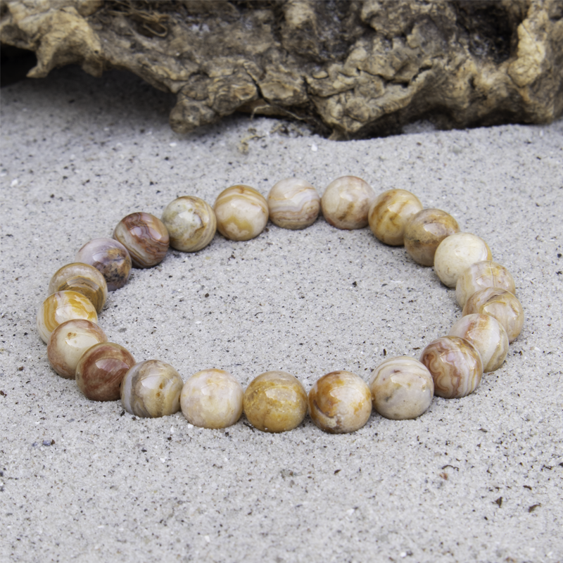 Smukt armbånd i Crazy Lace Agat med 8 mm polerede kugler, sat på elastisk tråd, så det er fleksibelt og behageligt at bære. Stenen er kendt for sine fascinerende mønstre i jordtoner blandet med livlige farver – hver perle er et unikt lille kunstværk.