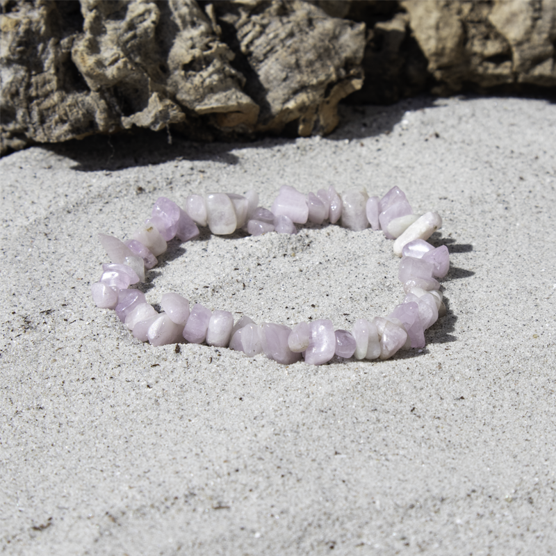 Smukt kunzit chip armbånd i onesize til voksne, der passer til enhver lejlighed. Armbåndet er sammensat af naturlige kunzit-stykker på elastisk tråd, hvilket gør armbåndet smidigt og behageligt at bære. Den bløde, rosa-lilla farve udstråler ro, kærlighed og spirituel dybde.