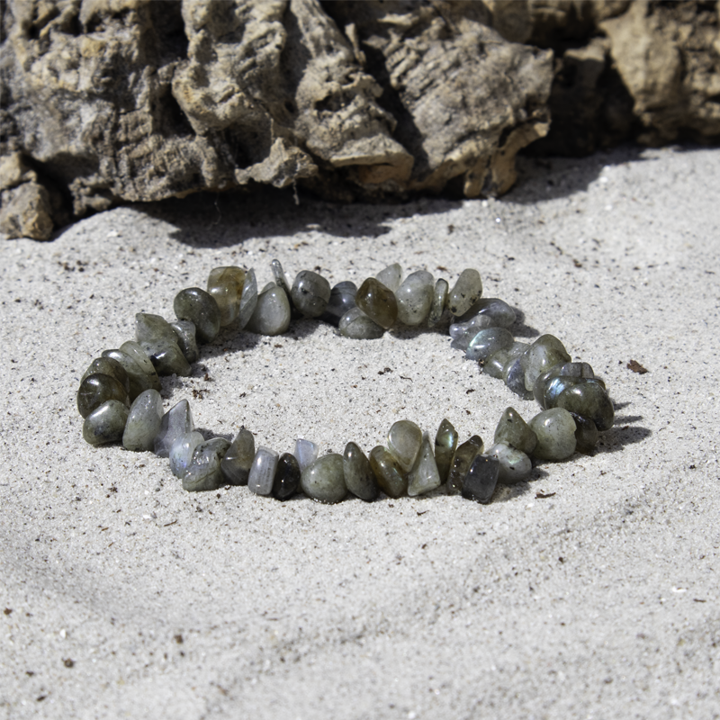 Smukt labradorit chip armbånd i onesize til voksne, der passer til enhver lejlighed. Armbåndet er sammensat med naturlige labradorit-stykker på elastisk tråd, hvilket gør armbåndet smidigt og behageligt at bære. Hver sten har sit unikke spil af farver og lys – kendt som labradorescens.