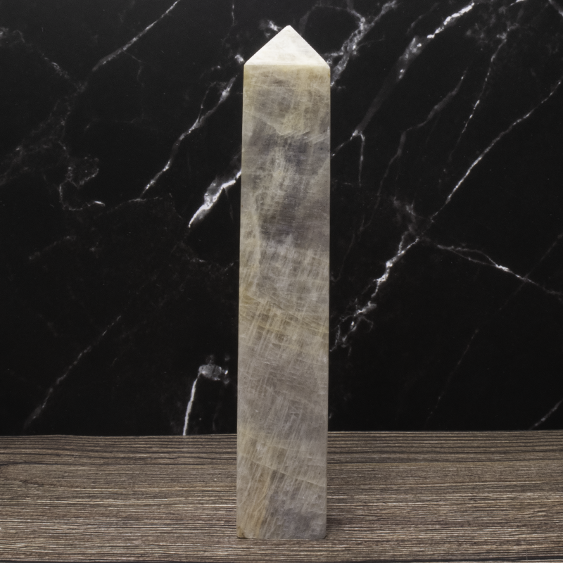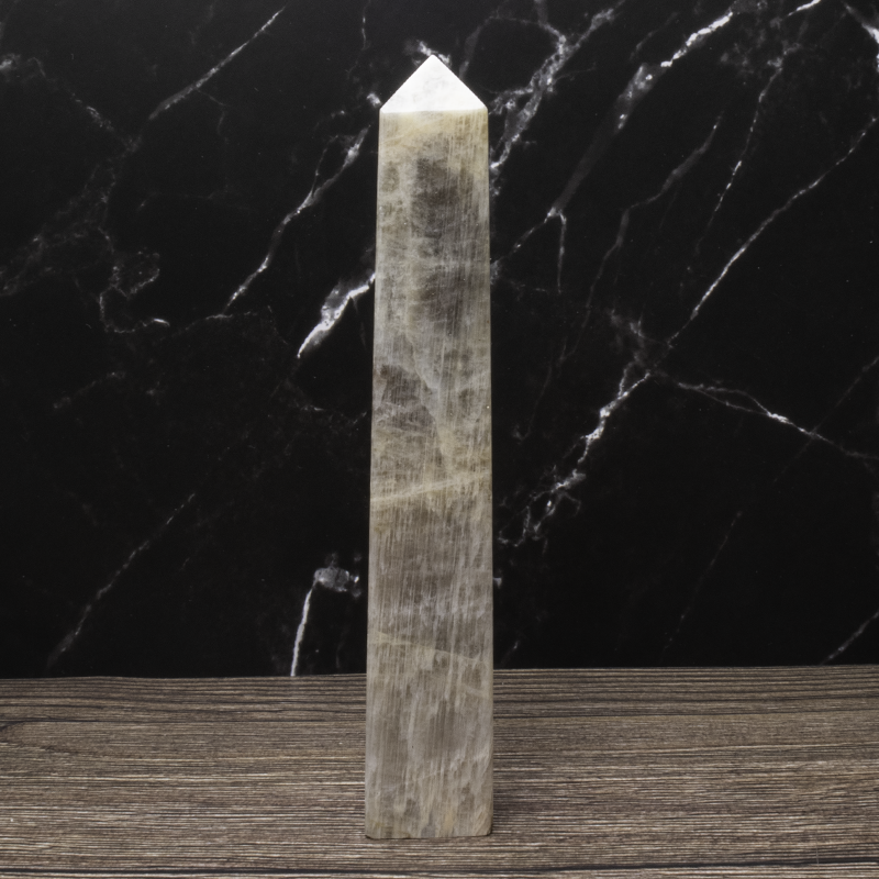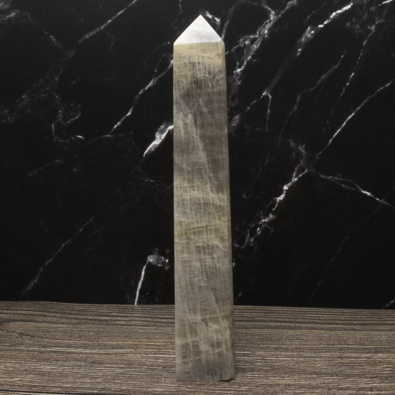 Månesten krystaltårn med smuk glød. Styrker intuition, følelsesmæssig balance og nye begyndelser. Perfekt til meditation og energiarbejde.