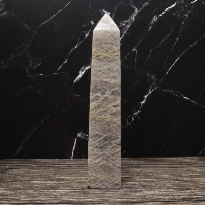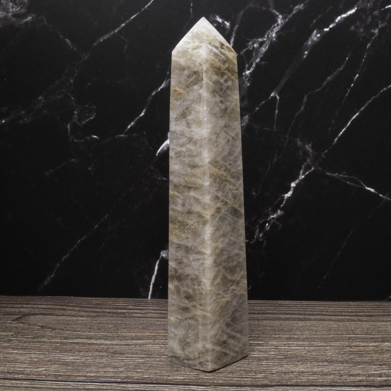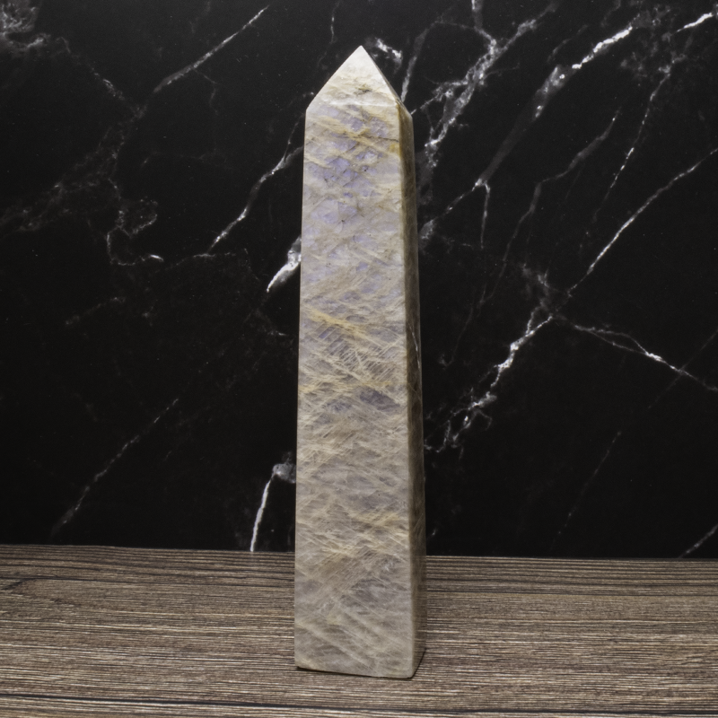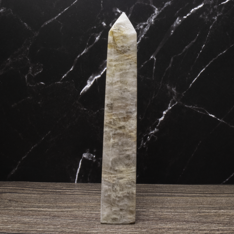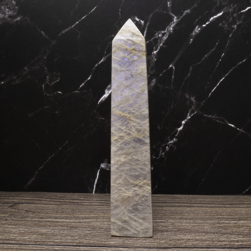 Månesten krystal tårn med smuk glød. Styrker intuition, følelsesmæssig balance og nye begyndelser. Perfekt til meditation og energiarbejde.