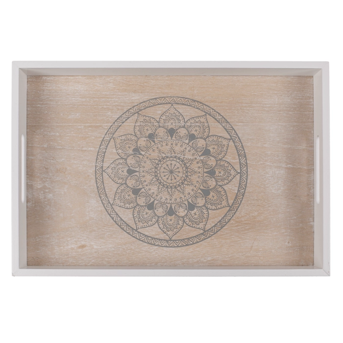 Mandala Træbakke | Hvid/Naturfarvet | Sæt af 2 | 35 x 24 + 30 x 20 cm.